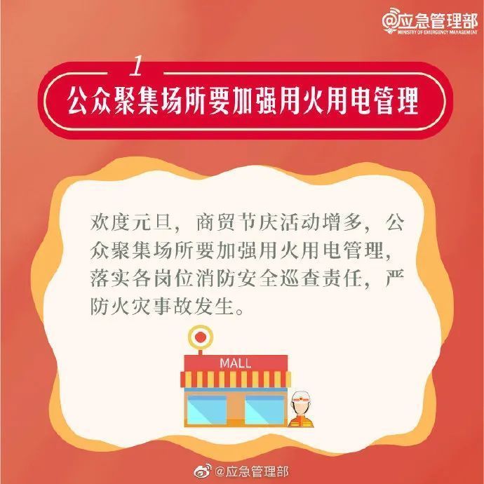 应急科普丨图说:元旦小长假,安全不放假! 2022-01-01 12:38:24 来源: 中华人民共和国应急管理部 元旦假期庆祝、商业活动较多,人流物流集中,火灾风险较高,要加强安全防范。欢度节日,安全莫忘! 元旦假期庆祝、商业活动较多 人流物流集中 火灾风险较高 要加强安全防范 欢度节日,安全莫忘! ↓↓↓