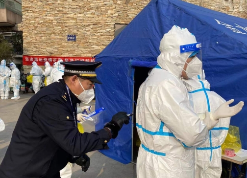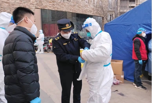 1月15日,未来路街道辖区发现确诊病例,未来路执法中队立即与街道办、社区、物业等部门对接现场情况,共同研判防控工作,执法中队全体党员干部下沉到社区,立即对小区所有出入口进行封控并做好小区居民的情绪安抚工作。为确保封控及时、以及居民生活防疫工作平稳有序进行,未来路执法中队中队长庞少军靠前指挥,驻扎一线。