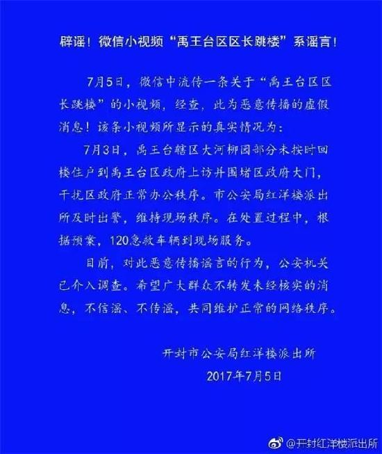 7月5日起,开封群众微信中流传一条关于“禹王台区区长跳楼”的小视频,然而经红洋楼派出所调查,此为恶意传播的虚假消息。